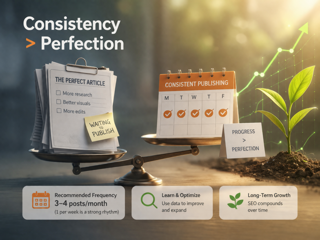 One of the most common blockers in hotel SEO is overthinking content quality. Teams wait for the “perfect article,” which slows down output and kills momentum.